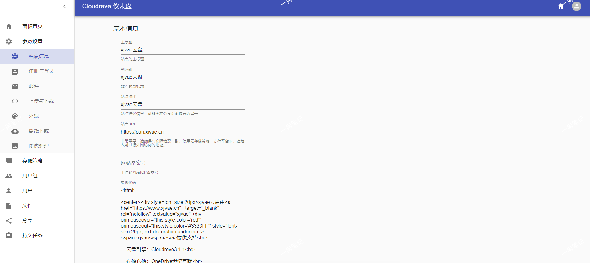 ②参数设置可自定义云盘名称、页脚代码等样式。